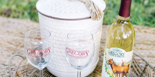 We have a large variety of Muscadine Wines to choose from dry, semi-sweet, and sweet. Our Gregory Vineyards wine glasses are the perfect keepsake.